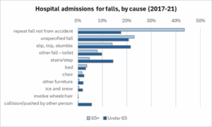 - Cause of the fall: For those aged 65+, the highest proportion of hospital admissions for falls (43%) were repeat falls not from accident, followed by unspecified fall (23%.) For under 65s, the highest proportion were slip/trip/stumble (21%) (Figure 10)