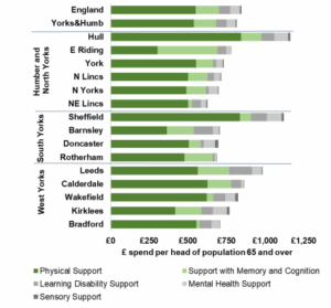 - In 2021/22, Kirklees spent £59.5m on long and short term care for the elderly. More than half of this money (54%) was spent on physical support (£32m); the proportion spent on mental health support in Kirklees (11.7%) was the highest in the region (Figure 13).