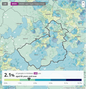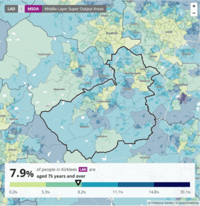 - The areas with the highest numbers and proportions of older people tend to be in the least deprived areas in Kirklees. This has a positive impact on their health outcomes compared those living in poverty and deprivation who experience multiple risk factors across the life course such as exposure to smoking, air pollution and access to green space, compared to those living in the least deprived areas (see Chief Medical Officer’s Annual Report 2023: Health in an Ageing Society). However, many of these areas are often beautiful and welcoming, but underserved in health care, with less accessible transport links and insufficient infrastructure designed for older adults, including housing. People who have moved to these new areas in later life often do not have the social support networks.