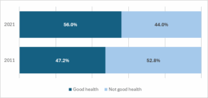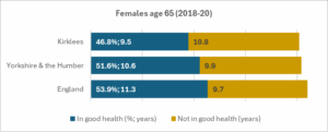 3.4 The 2021 census showed that more than half (56%) of those in Kirklees aged 65 plus self-reported to be in good health, an improvement compared with 47% in 2011 (Figure 6). The 2021 figure is similar to the value for England (58%) and Yorkshire and the Humber (56%).Figure 6 : Proportion of Kirklees population aged 65 plus in good health, 2011 and 2021