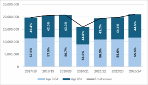 1.5 Healthcare requirements increase with age, with healthcare costs increasing steeply from around age 65 years (Figure 2). As an indicator of hospital activity, NHS Finished Consultant Episodes (FCEs) were higher in 2023/24 (over 21 million) compared with any of the previous 10 years. The proportion of older patients is also increasing – in 2023/24, patients aged 65 plus represented 44.5% of FCEs, equating to more than a million more FCEs for this age group (Figure 3, NHS England Hospital Admitted Patient Care Activity statistics).