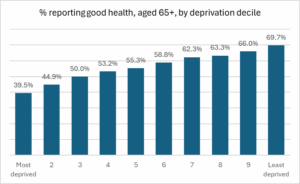 3.5 However, older people in more deprived areas of Kirklees are less likely to report good health compared with those in the least deprived areas: 39.5% of those aged 65 plus in the most deprived decile, compared with 69.7% in the least deprived decile (Figure 7).Figure 7 : Proportion of older population in Kirklees reporting good health, by deprivation decile
