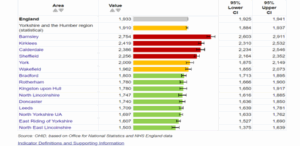 4.3 Area level deprivation is significantly associated with health outcomes and a major factor in health inequalities. Those living in the most deprived areas are more likely to have worst health outcomes, creating a cumulative impact throughout life course. Up to a quarter of older people in Yorkshire and Humber are living in income deprivation with Kirklees being in the worse 95% decile (Figure 15).